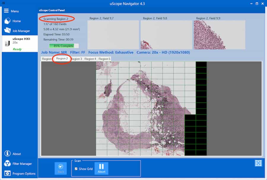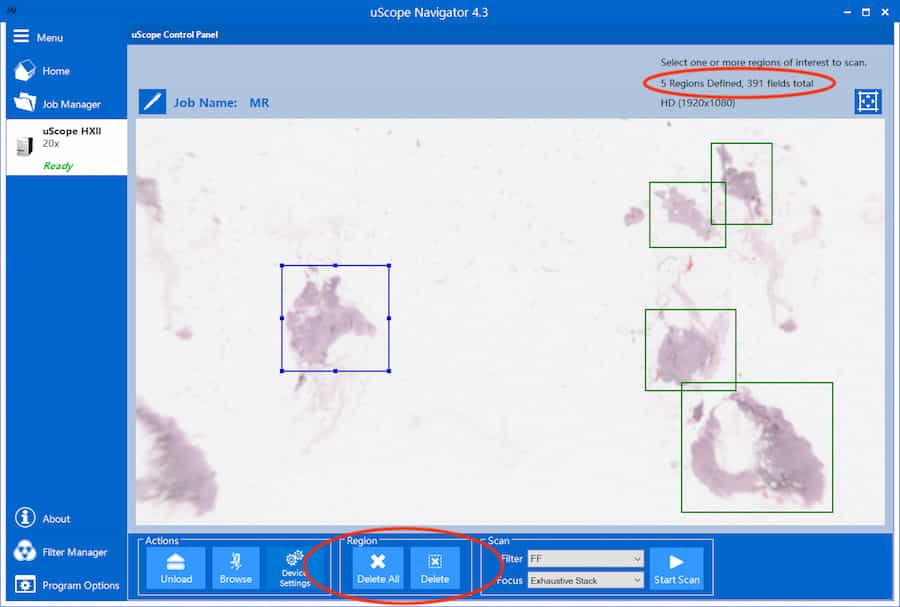 The uScope Navigator software allows you to select multiple regions to scan from a glass slide. There are several reasons why you may prefer to scan multiple regions instead of a single, large one: