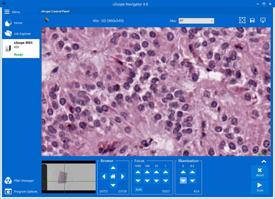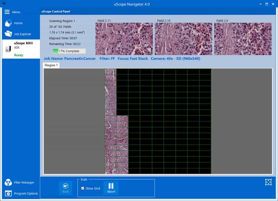 The uScope Navigator can scan a region of interest on your prepared slide. It does this by capturing multiple fields, one at a time, by moving the objective across a rectangular region of interest. Each field is saved in the folder of your choice as a standard JPEG image file. The uScope Navigator application can optionally combine the fields into a full-sized deep zoom image that you can view using a standard web browser.